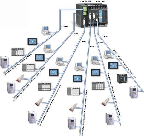 永宏P(guān)LC智慧型周邊連線 FBS-PLC之5個(gè)通訊埠可同時(shí)連結(jié)各種智 慧型周邊,界面則有USB、RS232、RS485、乙太網(wǎng)路可供選 擇,除可接用永宏標(biāo)準(zhǔn)通訊協(xié)定或Modbus通訊協(xié)定,或 透過(guò)FATEK通訊 伺服器來(lái)通訊外,尚可利用CLINK通訊 便利指令,自行定義protocol主動(dòng)或被 動(dòng)地與任何智慧型周邊連線。