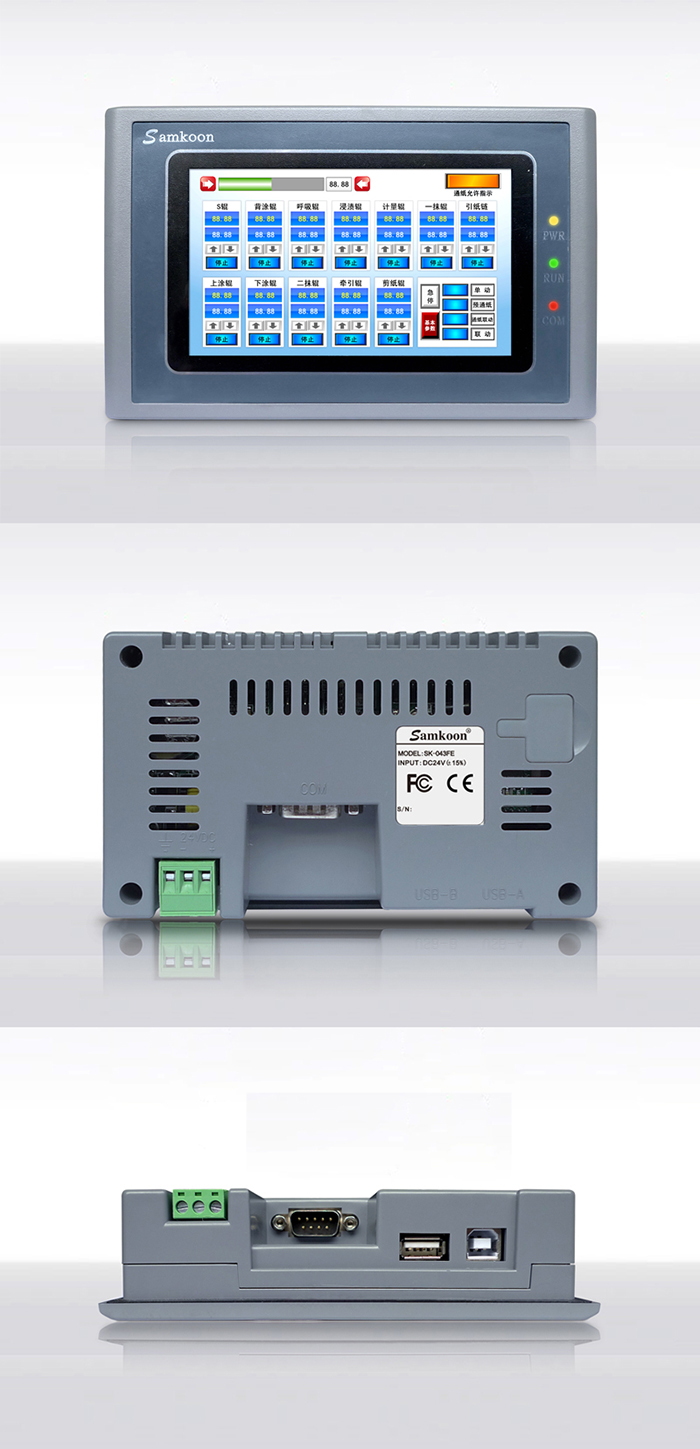 Samkoon SK系列觸摸屏是一款基于Linux系統的人機界面,符合EN55022和EN55024標準,符合FCC、CE、Class A,具有很強的抗干擾能力,符合工業環境的電磁兼容要求。該款產品配備有高性能的Cortex A8處理器,及高容量FLASH,可存儲大量數據,實現數據斷電不丟失;支持U盤存儲,可以實現數據的導入導出、工程更新及配方更新功能;支持在線及離線模擬,可直接從PLC中獲取數據;支持串口打印機,顯現畫面及數據打印;支持一屏多機,實現最大連接32個PLC或智能設備;支持多國語言,可實現5種語言任意切換;支持以太網通訊下載功能。